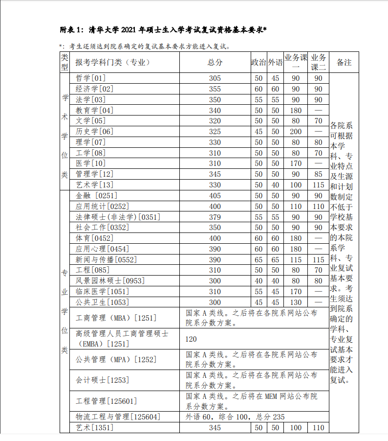 附表 1:清華大學(xué) 2021 年碩士生入學(xué)考試復(fù)試資格基本要求*