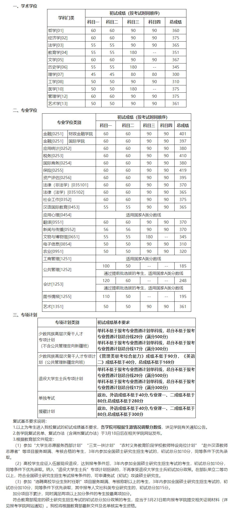 中國人民大學2022年碩士研究生招生復試基本分數線