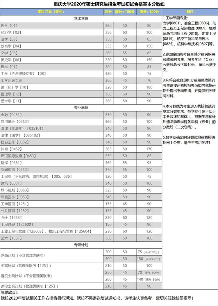 重慶大學(xué)發(fā)布2020年碩士研究生招生復(fù)試基本分?jǐn)?shù)線