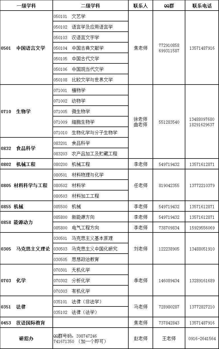 四、各調劑專業聯系方式