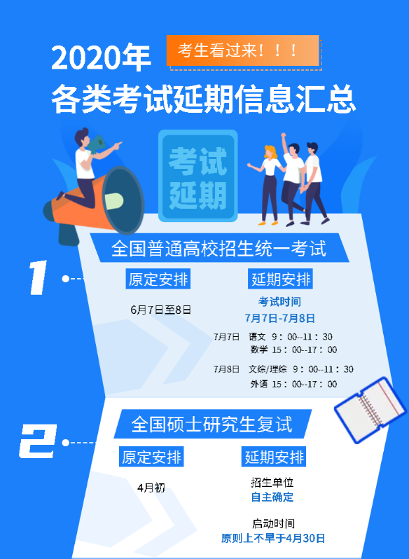 以上是小編為大家整理的“請(qǐng)查收:2020年各類考試最新消息匯總,部分教育考試延期!”的相關(guān)內(nèi)容,希望對(duì)大家考試有所幫助!