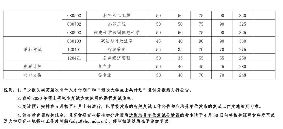 4.符合教育部相關(guān)規(guī)定,且享受研究生招生加分政策后達到培養(yǎng)單位復(fù)試分數(shù)線的考生請于4月30日前將相關(guān)證明材料發(fā)至武漢大學(xué)研究生院招生工作處郵箱(wdyz@whu.edu.cn),經(jīng)審核通過后準予參加復(fù)試。