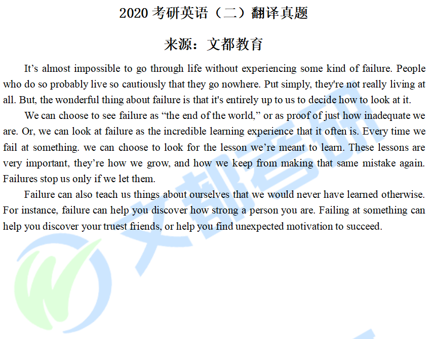 文都考研網(wǎng)為大家?guī)砹?020考研英語(二)真題(翻譯),備受大家關(guān)注的2020考研英語(二)翻譯真題作文也出爐了如果你還不清楚,不妨看看2020考研英語(二)翻譯真題的文章,如有需要及時加入陜西文都20考研交流群, 陜西文都考研網(wǎng)持續(xù)為您提供考研所需的相關(guān)指導(dǎo)信息。20考研資料共享:【互動可加群】丨官方網(wǎng)站【@陜西文都考研】
