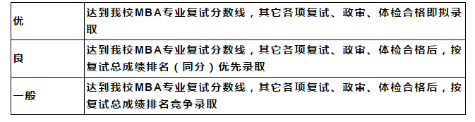 合格:預(yù)面試分?jǐn)?shù)60分以上。MBA擬錄取資格對(duì)照表如下: