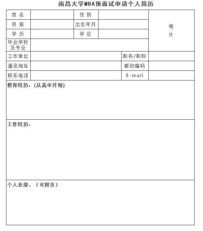 申請者填寫南昌大學(xué)MBA預(yù)面試申請個(gè)人簡歷南昌大學(xué)MBA預(yù)面試個(gè)人簡歷樣板(表格見南昌大學(xué)MBA教育中心網(wǎng)站上主頁“資料下載”中),并按下表時(shí)間提交到MBA教育中心或發(fā)送郵件至:E-mail:mba@ncu.edu.cn。咨詢熱線:0791-88304514